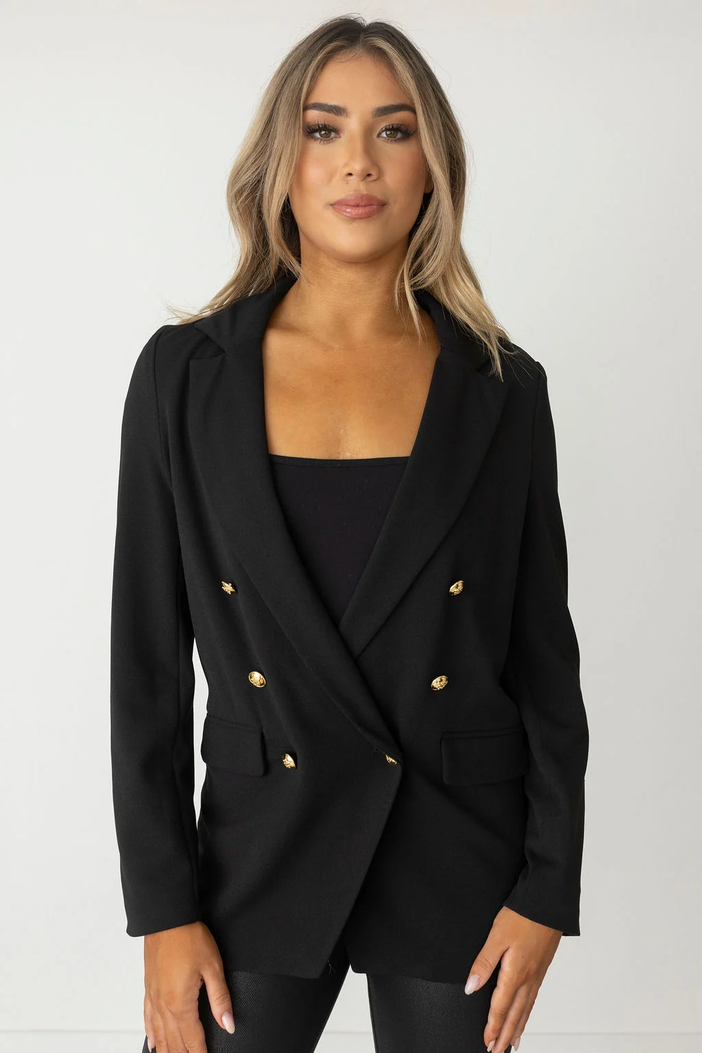 Be the first to review “KNIT CREPE NOTCHED LAPEL COLLAR DOUBLE BREASTED GOLDBUTTON BLAZER”